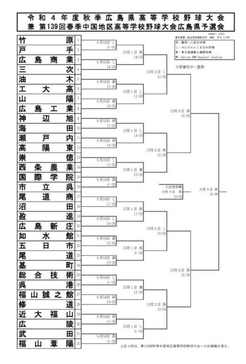 | センバツ8強の広島商、初戦の相手は総合技術 広陵は竹原と 春季広島県高校野球 春季広島県高校野球大会(19日開幕)の組み合わせ抽選会が15日、尾道市のダッシュこざかなくん陸上競技場であった。32校によるトーナメント方式で、決… (出典:中国新聞デジタル) |
